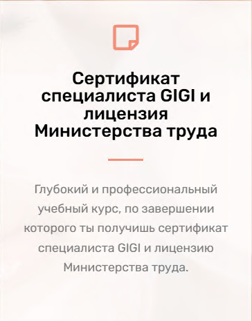 Глубокий и профессиональный учебный курс, по завершении которого ты получишь сертификат специалиста GIGI и лицензию Министерства труда.